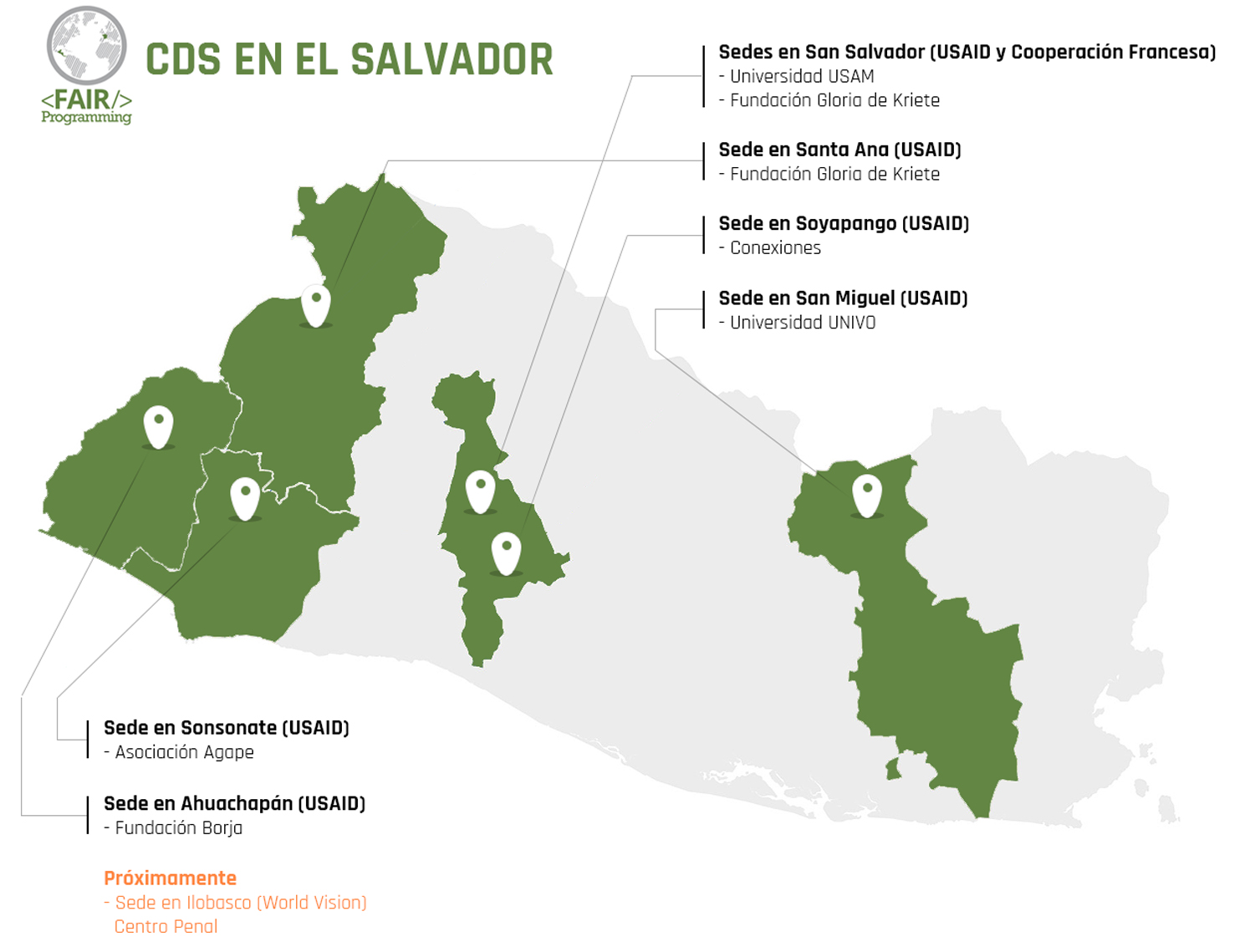 Primer proyecto piloto con Cruz Roja salvadoreña y el Comité Internacional de la Cruz Roja (CICR)El primer centro, se ha creado en 2015 en Ciudad Delgado, en El Salvador. Hemos capacitado a unos 470 jóvenes, de los cuales unos 112 han podido concretizar el acceso a empleo formal. Luego otro CDS se abrió en Cojutepeque.